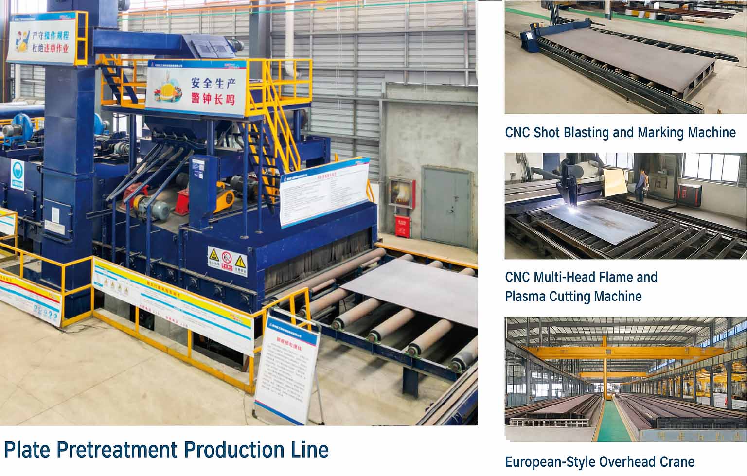 We have a complete steel structure production line and production equipment, including steel plate pretreatment production line, cutting machine, crane, welding machine, CNC bending machine, CNC flat drilling machine, robotic intelligent welding workstation, etc.