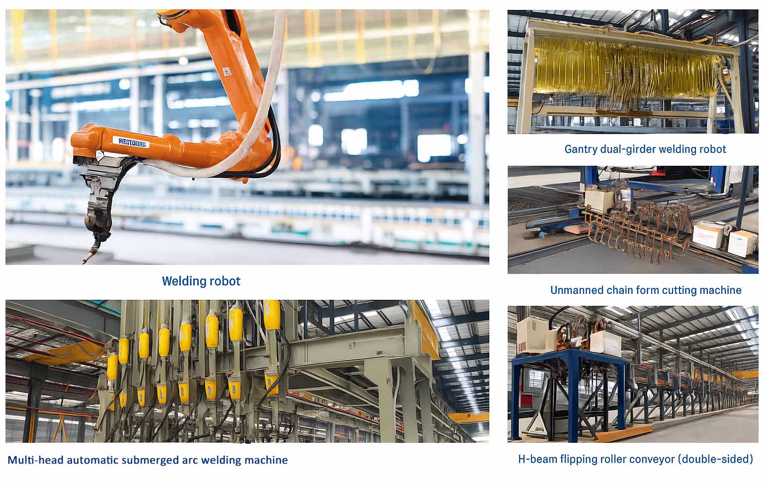 We have a complete steel structure production line and production equipment, including steel plate pretreatment production line, cutting machine, crane, welding machine, CNC bending machine, CNC flat drilling machine, robotic intelligent welding workstation, etc.